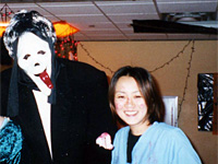 HalloweenにBloody Doctorというテーマで。ホストファミリーが本物の医者の服を貸してくれて、血のりをべったりとつけてくれました