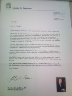 オーストラリアにこの1月から留学する学生さんに宛てにビクトリア州教育部門の大臣Maritn Dixon氏よりwelcome letterが届きました!