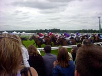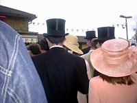 なんと、こんな結婚式に行くような格好で競馬ですよ。ぶったまげですよね。日本の競馬のイメージと全然違うでしょ 。日本は、ハンチング帽をかぶって耳の上に鉛筆引っ掛けて競馬新聞握り締めてるおやじの姿が競馬場での正装という気がいたしますが、こちらの競馬場は本来高貴な方々の社交場なのでございます。ですからとてもお上品ですのよ。おほほ。特に毎年6月の中旬におこなわれる女王主催の競馬ロイヤル・アスコットは、女王自らが馬車に乗って競馬場に登場するというイベント付き!女王と場を共にするということで、この競馬場、しっかりとドレスコードがあるのです。で、皆さんこんなに着飾ってるってわけ。というか着飾らないと競馬場への入場そのものを拒否されてしまうのでございます。おほほ。ちなみにこの競馬場、入場料も結構お高いの。普通のお席のお値段が日本円になおすと8000円ぐらいかしら。8000円払って競馬見るのかあなどど驚いてはいけません。競馬場の中にはフルコースを出すレストランもいくつかございまして、もしそこでお食事をなんて思ったら、軽く5万円は越えてきます。ひえ〜!!