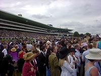 でも、ご心配なく。私のような下々の者がドレスコードを気にせずに競馬を見ることを許される末席エリアも競馬場のにはあるのです。女王の席からははるか遠く、もう何が何だか分からないぐらいに離れたこの端っこエリアの入場料は1500円ほど。お食事はフルコースのお弁当を頼むと3500円ぐらいかかりますが、持ち込みも可です。ということで、ここの末席エリアにはピクニック気分でお弁当持って競馬を楽しみに来るという方が多く、とてもカジュアルな雰囲気。でも、カジュアルといってもジーンズ姿の人はあんまりいなかった。男性はほとんどがスーツだし、女性もサマードレスにお帽子というそこそこの格好の方が多かったよ。 |