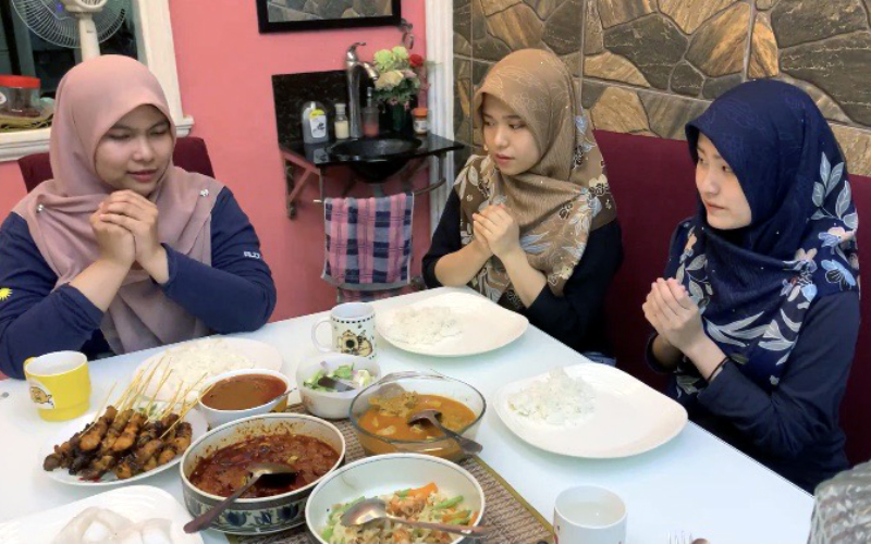 マレー系の友達にお願いしてマレーの文化体験をしました。イスラム教の文化では、女性は外出時と家族以外の男性の前ではヒジャブという布を巻いて髪を隠します。また、食事の際にスプーンやフォークなどを使わずに右手のみで食べます。写真は、食事の前のイスラム教のお祈りを教えてもらっている様子です。