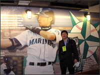 | 取材の合間に、セーフィコフィールド内にあるイチローの写真の前で |