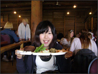 A:大学で心理学を専攻しているので、福祉施設に興味を持ち、研修先に選びました。日系・アジア系住民のための老人福祉施設で4週間研修したのですが、毎日刺激的でした。月〜金と通って、秋祭りの時は、日曜日も手伝いました。月水金は、入居者以外のお年寄りがアクセスバスに通ってやってきます。ですから特に業務も忙しく、お昼ご飯のお世話をして一緒に食べたり、体操したり。他の曜日も午後は、アクティビティが豊富に入っていて、数字を使った頭の体操のゲームなどクラフトをやったり。準備を手伝ったり、一緒に楽しんだりしました。