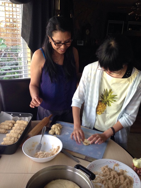 写真は、ホストマザーと一緒にお料理をしているところ。スパニッシュブレッドというものらしいです。