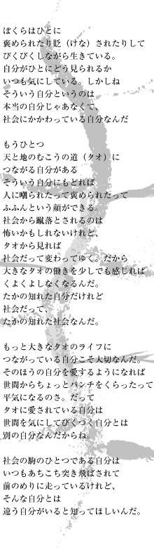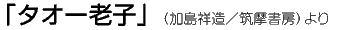 詩人でもある著者、加藤祥造さんは信州、伊那谷に住む自称「 タオイスト」。著作は他に「 タオ・ ヒア・ナウ」( パルコ出版)、「伊那谷の老子」(淡交社)など多数。