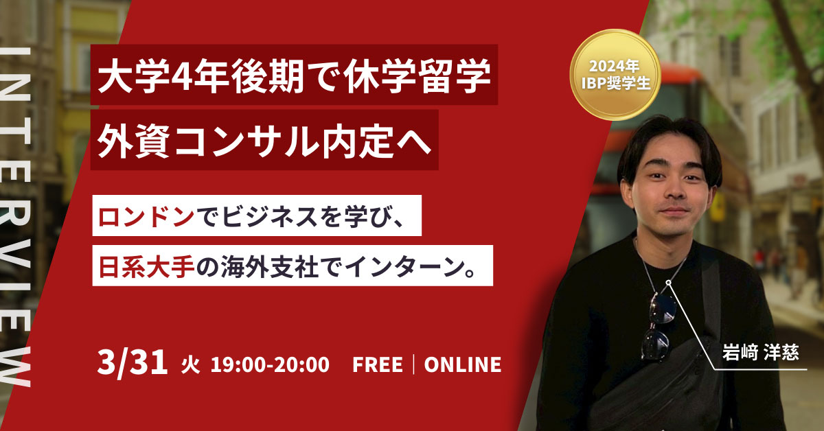 本説明会では、奨学金に合格して実際にIBP留学に参加した先輩を招き、留学中のリアルな経験談と、奨学金に合格するための具体的なアドバイスを直接伺います。